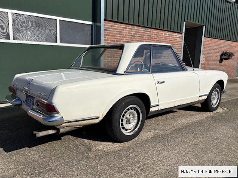 A complete and original Mercedes-Benz 250 SL Pagode Cabriolet from 1966 - In the original color combination of White (050) with a brown interior (120) - This Mercedes SL comes with the correct hardtop in the color of the car - It is an original European delivered car that still has the European H1 headlights and an odometer - This Pagode was first driven in Germany for a number of years and was then transported to Colorado/USA, where it was recently discovered and brought back to Europe - A complete and original car for restoration - The engine is the original and matching engine - Equipped with a factory-fitted automatic transmission - An interesting car because a 250SL was only produced for 1 year! - Only 5,196 250 SLs were produced, making the 250 SL the rarest variant of the W113 series - Compared to a 230 SL, a 250 SL has a more powerful engine with more torque, a larger fuel tank, and rear disc brakes - The soft top is old and in original condition but needs some attention - The data card is present - This Mercedes Pagode is at our showroom in Holland and all EU importduties and VAT have been paid already - USA import; all documents for obtaining an EU registration are present - Viewing by appointment only - Delivery of the car is possible